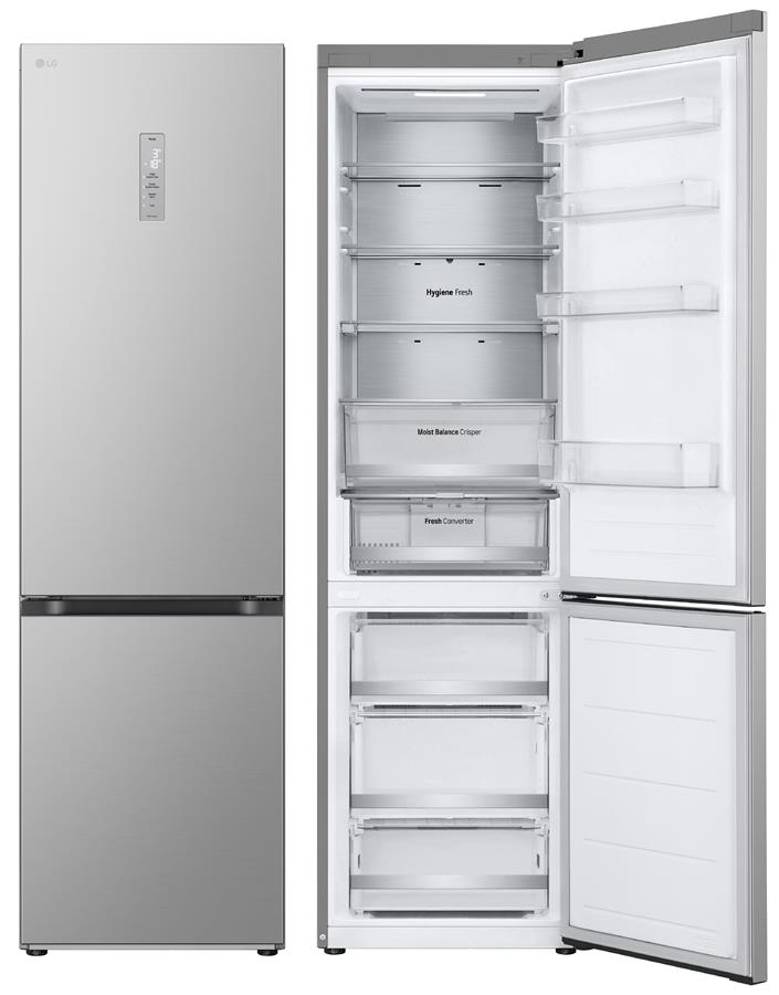 Холодильник LG з нижн. мороз., 203x60х68, холод.відд.-277л, мороз.відд.-110л, 2дв., А++, NF, інв., диспл зовн., зона св-ті, Metal Fresh, сріблястий