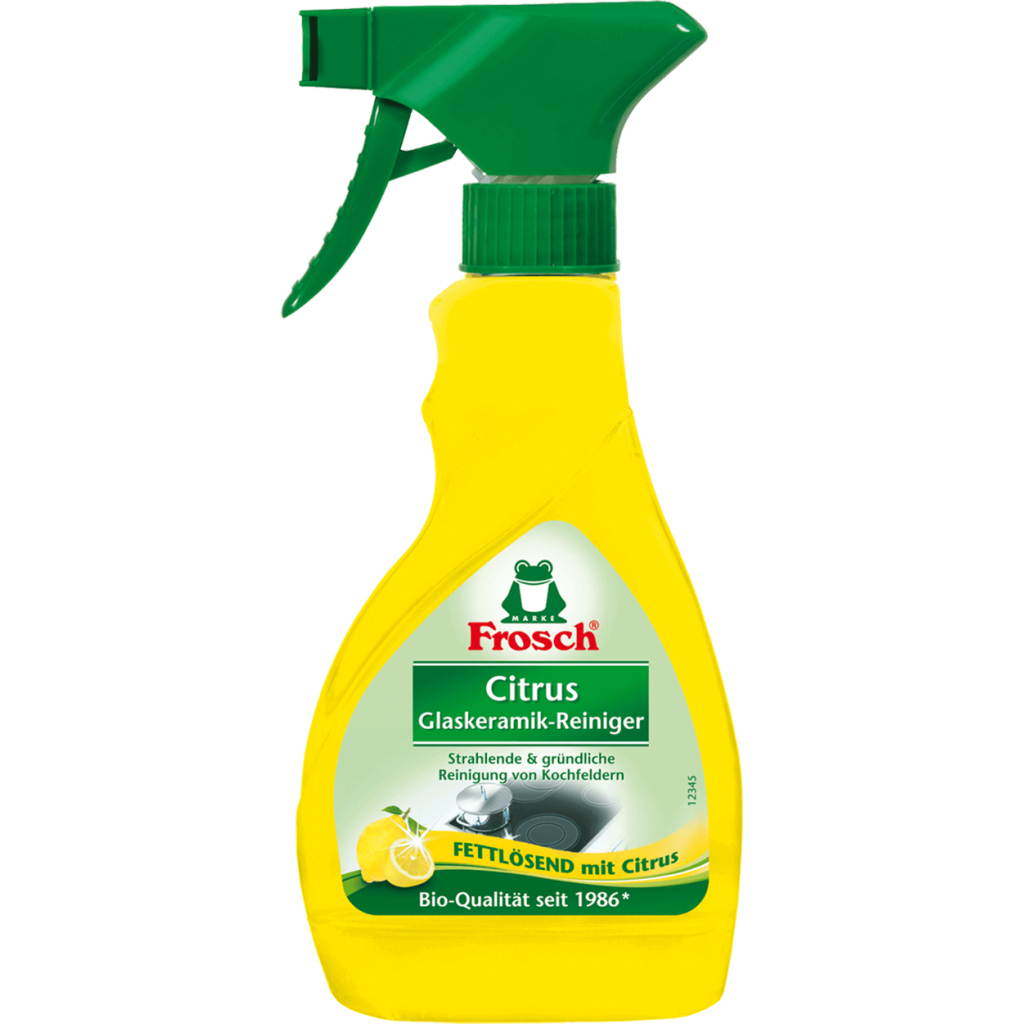 Frosch видаляє жир, залишки їжі та пригорілі стійкі забруднення з індукційних та склокерамічних поверхонь, забезпечує довготривалий блиск. Формула з лимонною олією ретельно чистить і поширює приємний аромат.