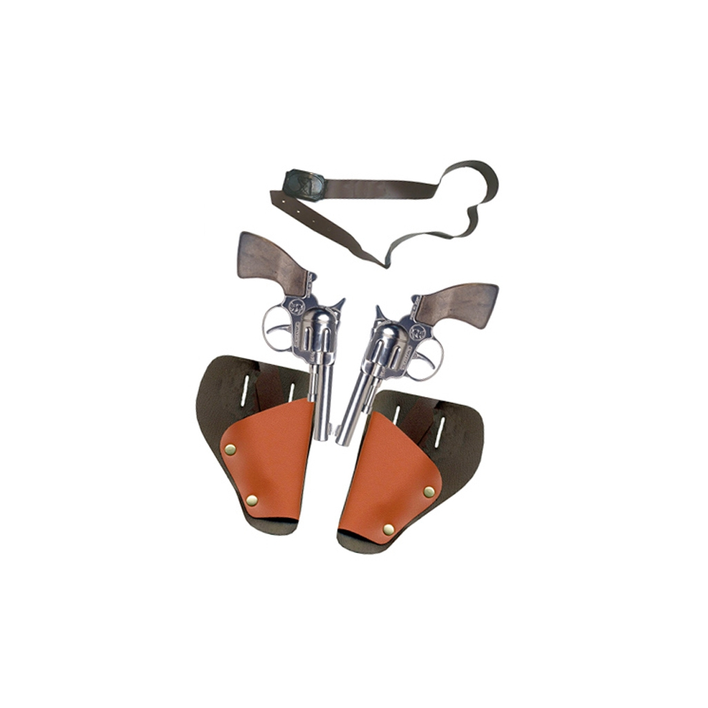 В наборе 2 цельнометаллических звуковых револьвера, 2 кобуры с поясом.