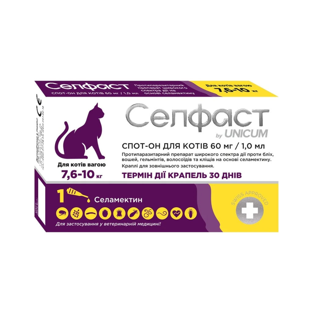 Краплі для тварин Селфаст від бліх, кліщів та гельмінтів на холку для котів 7.6-10 кг (4820275971456)