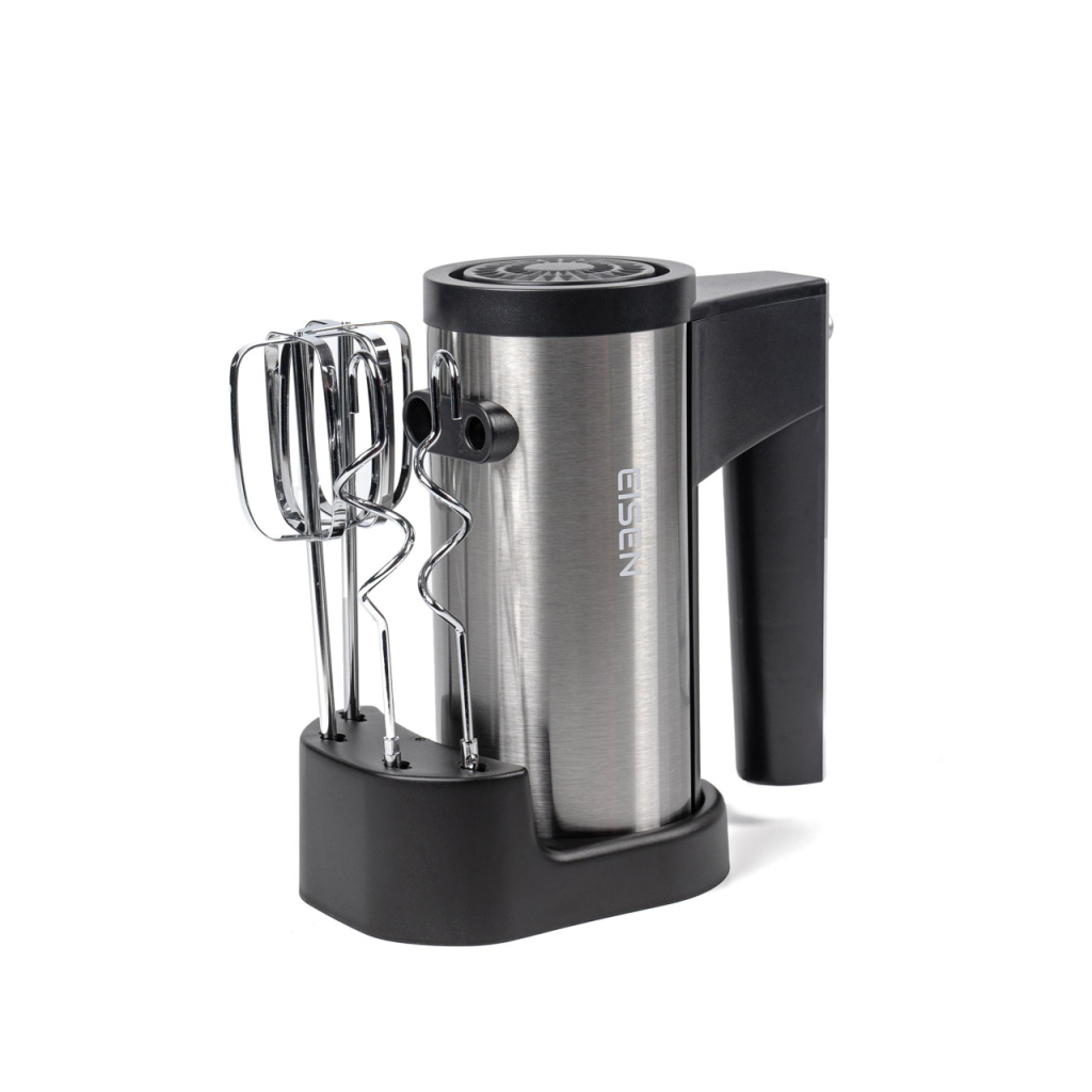 Легкая и компактная модель EISEN EHM-05B представлена в стильном черном цвете с эффектными металлическими вставками. Корпус миксера изготовлен из качественного пластика, а венчики для взбивания и крюки для теста – хромированной стали.