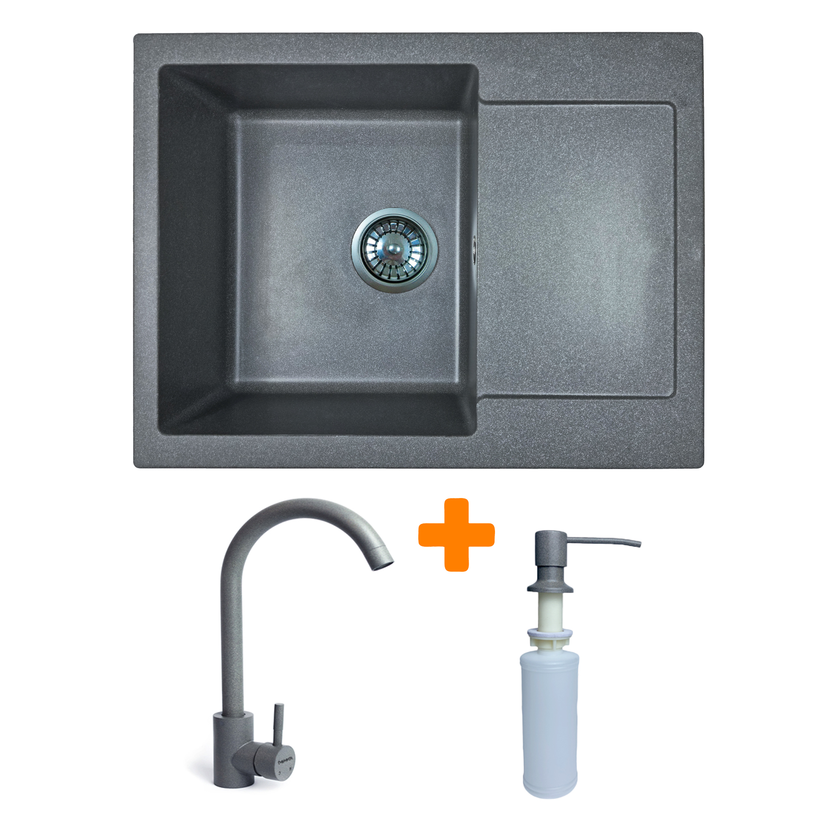 Набор кухонный Adamant Minimal, искусственный камень, прямоугольный, с крылом, 615х495х200мм, чаша - 1, врезная, серый + смеситель и дозатор