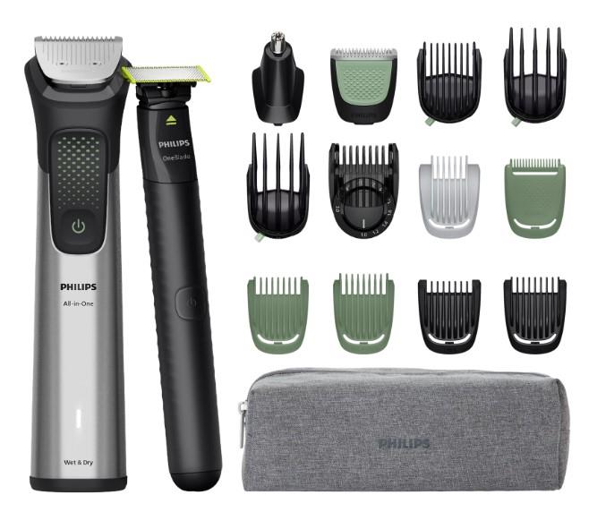 Триммер Philips Series 9000, для лица, головы, тела, акум., насадок-17, OneBlade в компл., сталь, серый